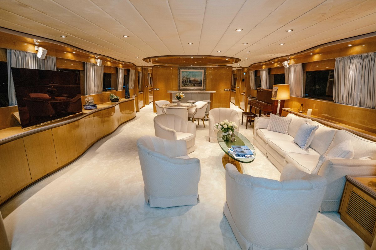 Elegant 150ft superyacht with accommodations for up to 14 guests comfortably. Adding to the ambiance are delicate lamps and ceiling lights, casting a gentle radiance throughout the space.